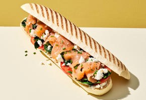 Een warme Pastridor Panini Gekruid wordt belegd met zachte plakken gerookte zalm, friszoete rode biet en een romige komkommer-dille roomkaas. De toevo...