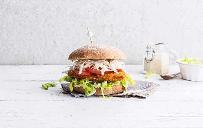 Zet een klassieker op je menu met deze café hamburger. Het luchtige Pastridor Café Hamburger Bun is gevuld met een krokante kipburger, frisse Romeinse sla en schijfjes tomaat. De Hellmann’s Honey Mustard Dressing zorgt voor een zoete en pittige finishing touch. Extra bite komt van knolselderreepjes. Een eenvoudige, maar onweerstaanbare keuze voor lunch of diner.