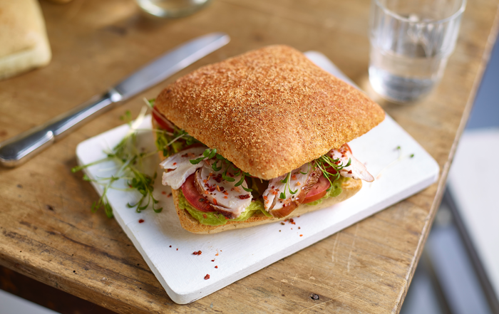 Geef je gasten een pittige en frisse lunchoptie met deze Sandwino Chili Chicken Guacamole. Het licht pittige Pastridor Sandwino Chili Bun wordt royaal belegd met malse gerookte kipreepjes, romige guacamole en sappige tomaat. Een topping van tuinkers en chilikruiden voegt zowel frisheid als een pittige kick toe. Voor een snelle, maar smaakvolle maaltijd on-the-go.