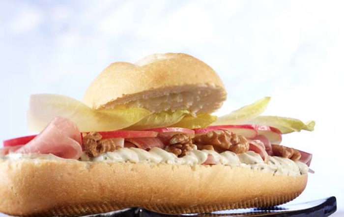 Een Pastridor Half Frans Stokbrood wit gevuld met een frisse Waldorf-salade op basis van Gandaham, appel en walnoten. Witloofblaadjes geven een verfijnde crunch, terwijl een romige pesto-roomkaas zorgt voor extra smaak. Een lichte lunchoptie met een rijke mix van texturen en smaken.