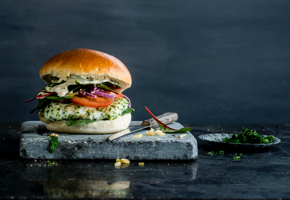 Le luxueux Pastridor Premium Brioche Hamburger Bun constitue la base de cette création végétarienne à base d’aubergines grillées et de champignons des...
