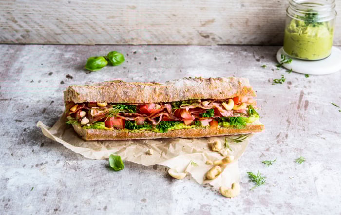 Laissez-vous séduire par les saveurs intenses de cette baguette d’inspiration mexicaine. La baguette grise à base de levain sert de base à du bacon salé et à un mélange coloré d’herbes telles que l’aneth, le persil et le basilic. Une couche onctueuse de guacamole apporte une touche surprenante de douceur qui contraste agréablement avec le croquant des noix de cajou et la fraîcheur des tomates. Agrémentée d’un filet d’huile d’olive et de sauce sandwich Hellmann’s Deli, cette baguette est un vrai régal pour les sens. Un choix savoureux pour un lunch copieux ou un en-cas raffiné.