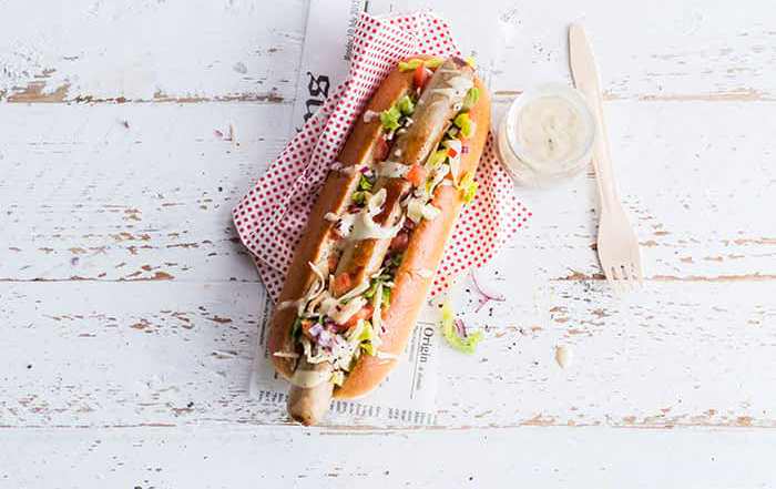 Donnez une touche funky au hot-dog classique. Le Pastridor Brioche Hotdog Bun offre une base délicieusement moelleuse et sucrée pour la saucisse blanche au persil, le chou blanc croquant et la garniture à la tomate et à l’oignon. La sauce Hellmann’s Honey Mustard Dressing et la vinaigrette Cider Sherry ajoutent une dimension gustative unique. Des oignons croustillants viennent compléter ce plat de streetfood.
