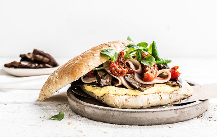 Un sandwich qui s’inspire des saveurs du Maroc. L’aubergine grillée et les tomates séchées apportent des notes profondes et savoureuses, tandis qu’une délicieuse tartinade au curry rehausse le goût de cette recette méditerranéenne. Du poulet fumé tendre et de la mâche croquante viennent compléter le Pastridor Sandwino Sun Bun. Une option cosmopolite pour une pause savoureuse.