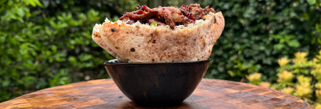 Il Pastridor Naanta offre una miscela perfetta di sapori tradizionali con un tocco moderno, ideale per qualsiasi pranzo saporito. Questo panino speciale, che combina pita e naan, viene cotto brevemente su una pietra calda per un aspetto artigianale con gustosi "punti di bruciatura". Condito con succoso shawarma di costata di manzo e spezie ricche, è un'esperienza saporita da non perdere. Il gusto morbido e dolce del panino si sposa perfettamente con i sapori intensi dello shawarma di costata e ha anche un aspetto artigianale!