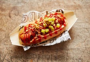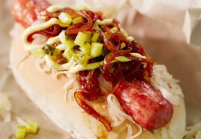 Een Pastridor Hot Dog Broodje Classic Wit met een sappige braadworst, gekookte zuurkool en gekarameliseerde uitjes. Augurk en een lichte vinaigrette z...