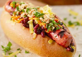 Een Pastridor Hot Dog Broodje Classic Wit krijgt een stevige vulling van rookworst, zwarte bonen en gesmolten cheddar. Romige mayonaise en een lichte ...